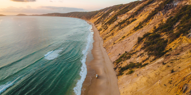 Der Strand selbst ist weit und unendlich lang – perfekt für lange Spaziergänge, Reiten am Strand oder Touren mit dem 4WD-Fahrzeug direkt am Meer entlang. Rainbow Beach ist zudem einer der wichtigsten Startpunkte für Touren nach K’gari (Fraser Island), der größten Sandinsel der Welt und UNESCO-Weltnaturerbe.