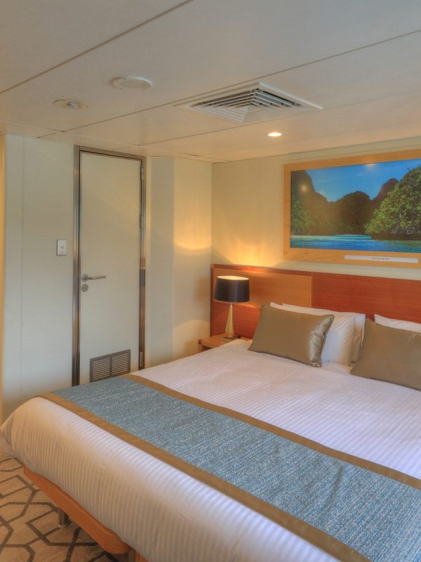 Unsere 19 geräumigen Kabinen auf dem Promenadendeck (Kategorie A) sind 18 m² groß und verfügen über Panoramafenster, die einen weiten Blick auf das Meer bieten. Außerdem sind sie mit einem Sofa, einem Schreibtisch, einem Telefon und wahlweise mit einem Junior-Kingsize-Bett oder zwei Einzelbetten ausgestattet. Das kompakte Bad verfügt über eine Toilette, eine Dusche und ausreichend Stauraum.